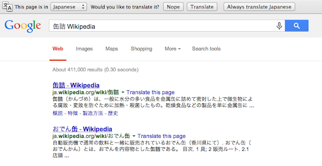 ReplyDeleteRosemary's comment reminded me: I didn't finish writing the answer to this challenge. If you're interested, I've updated the Answer (see above) with the REST of what I meant to write. In particular, the multi-language Wikipedia is your friend here, and I show how to search for *kanzume* in the Japanese Wikipedia. (Hint: You need to use Japanese.)